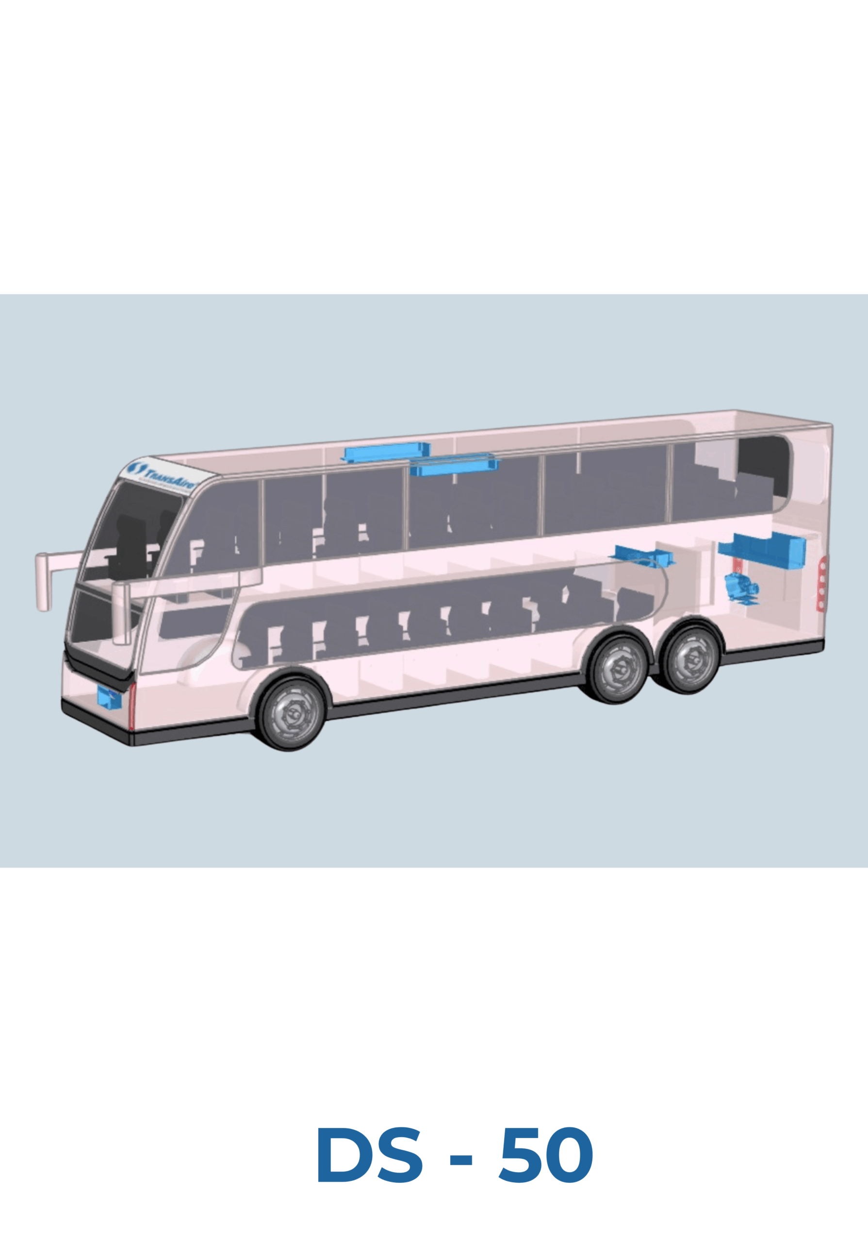 El modelo DS – 50 fue desarrollado para la línea de buses de 2 pisos, ajustándose a la medida de cualquier carrocería. Es un equipo liviano de alta eficiencia y ventilación por ductos. Gracias a su montaje interior, maximiza y acelera el rendimiento y reacción a la temperatura interior. Este modelo tiene una unidad condensadora instalada en la parte posterior del vehículo sobre el motor.